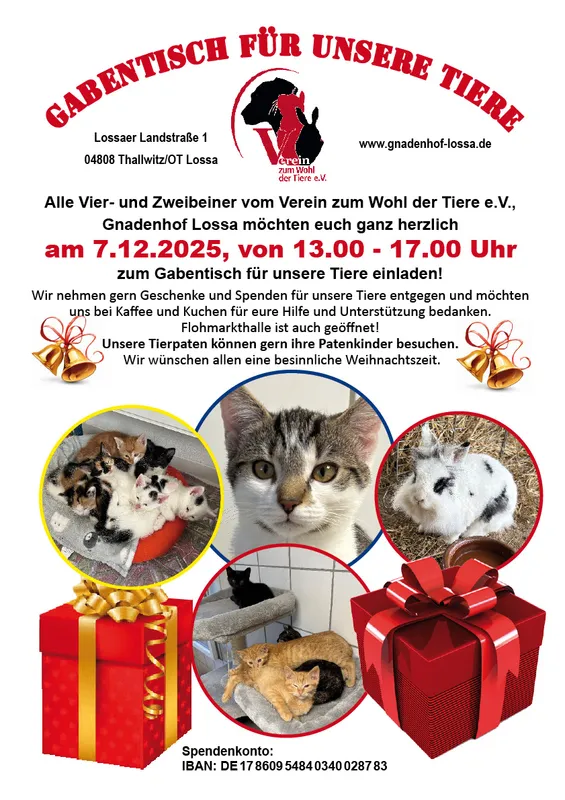 Am 7.12.2025 möchten wir Tierfreundinnen und Tierfreunde, Patinnen und Paten (und die es noch werden wollen 🙂 ), Spenderinnen und Spender ab 13.00 Uhr ganz herzlich zu uns einladen, um uns bei Euch zu bedanken.